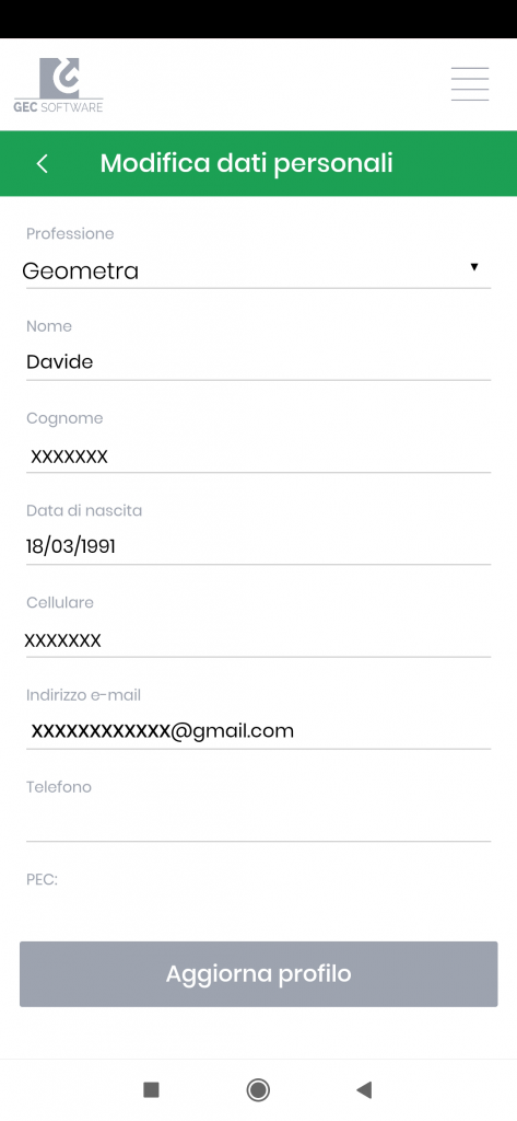 I dati contenuti all’interno del tuo Account sono solo in parte modificabili. Per questioni di sicurezza, ti diamo la possibilità di modificare in autonomia esclusivamente i tuoi dati di contatto. Per farlo dovrai scaricare l’APP gratuita “Supporto GEC” che ti consentirà di modificare e consultare tutte le informazioni sul tuo account. Se ti dovessi accorgere che alcune informazioni come Nome, Cognome, Codice Fiscale o Partita Iva sono errate, potrai sempre modificarli contattando i nostri uffici allo 0825-1912258 o al 351- 8816664. Saremo lieti di apportare tutte le modifiche che desideri